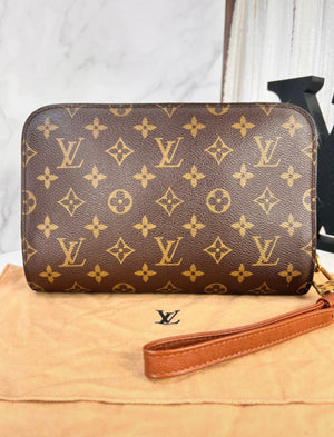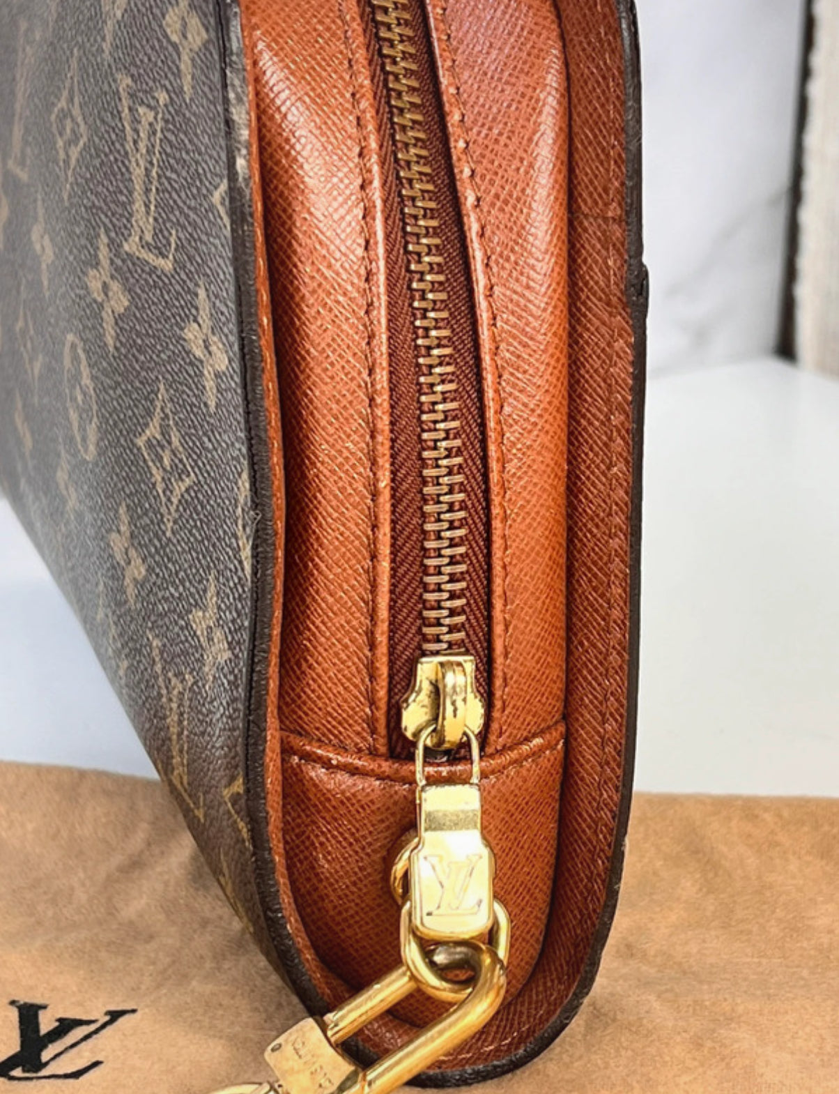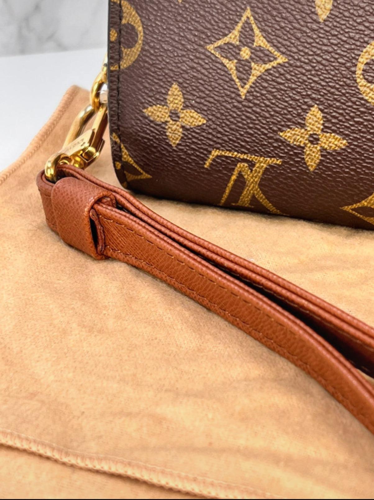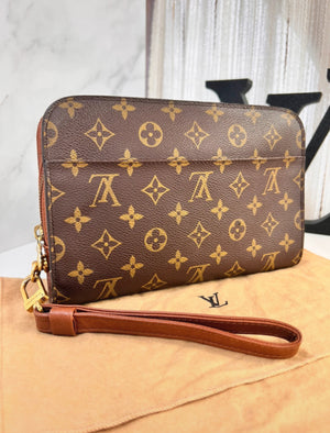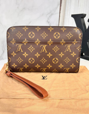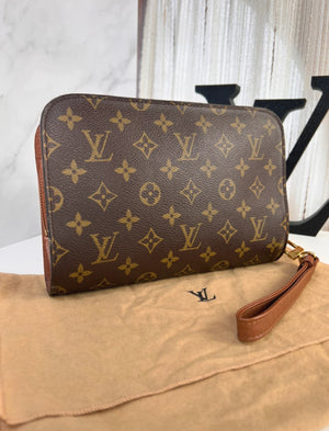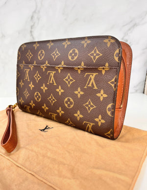 Superbe pochette Louis Vuitton Orsay en toile Monogram avec dragonne latérale amovible.