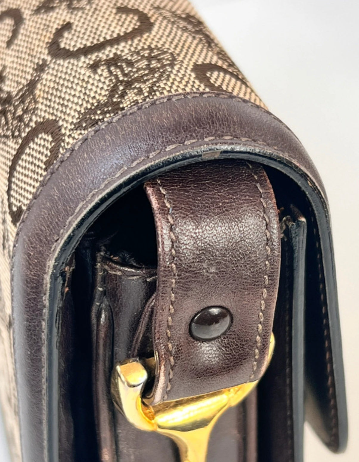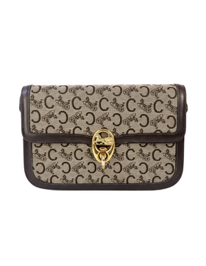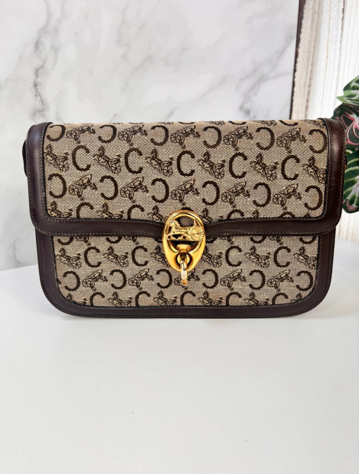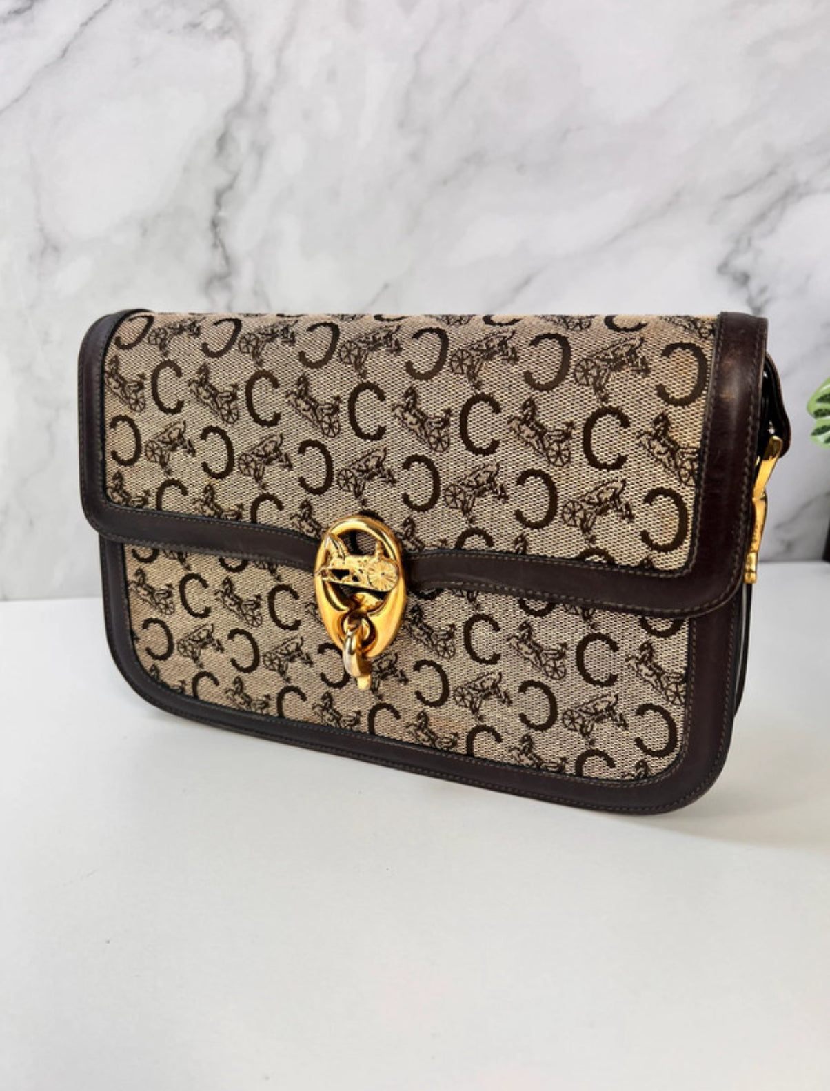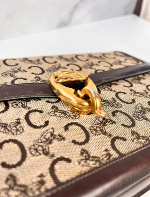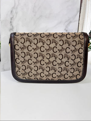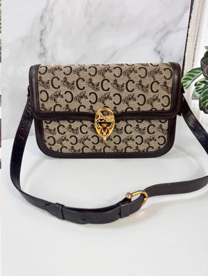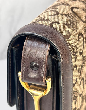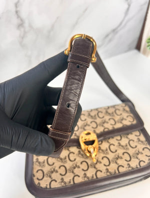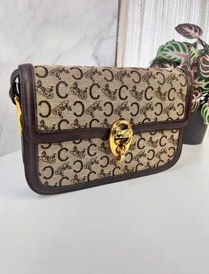 Authentique sac Céline vintage en toile Macadam Carriage et cuir brun, avec fermoir doré emblématique en forme de cheval et calèche.