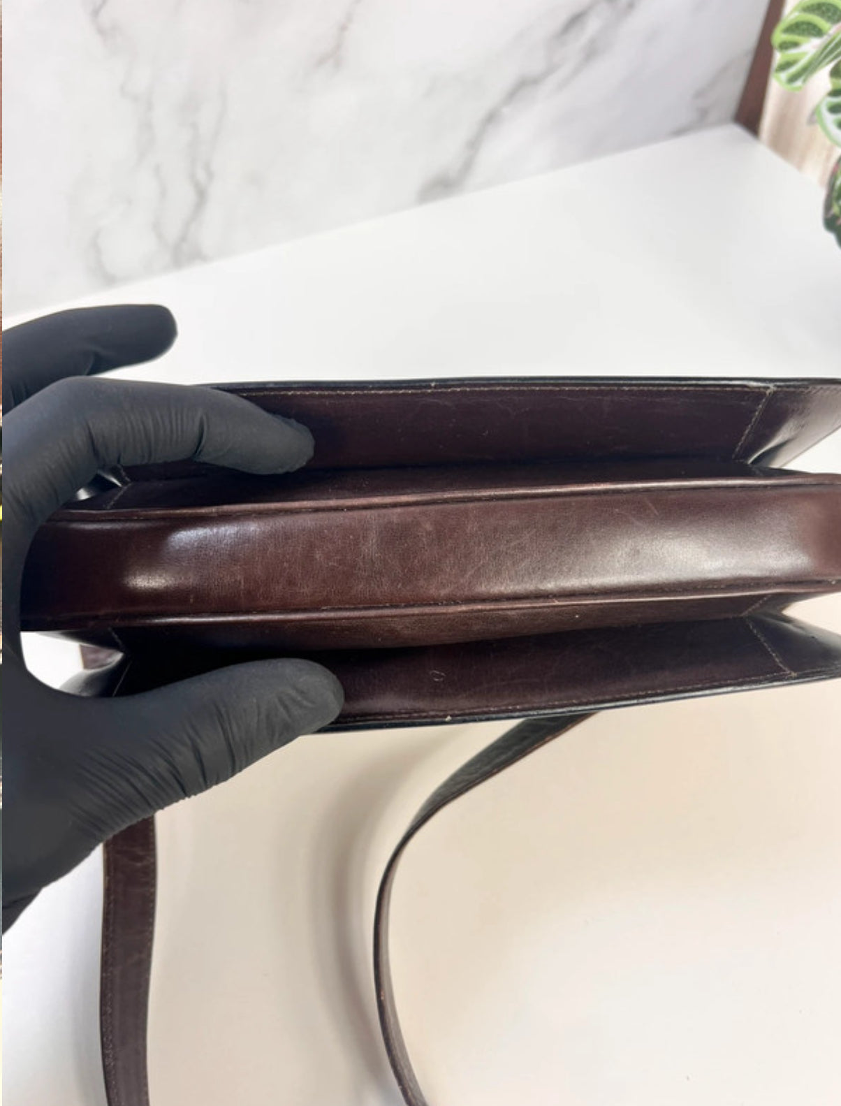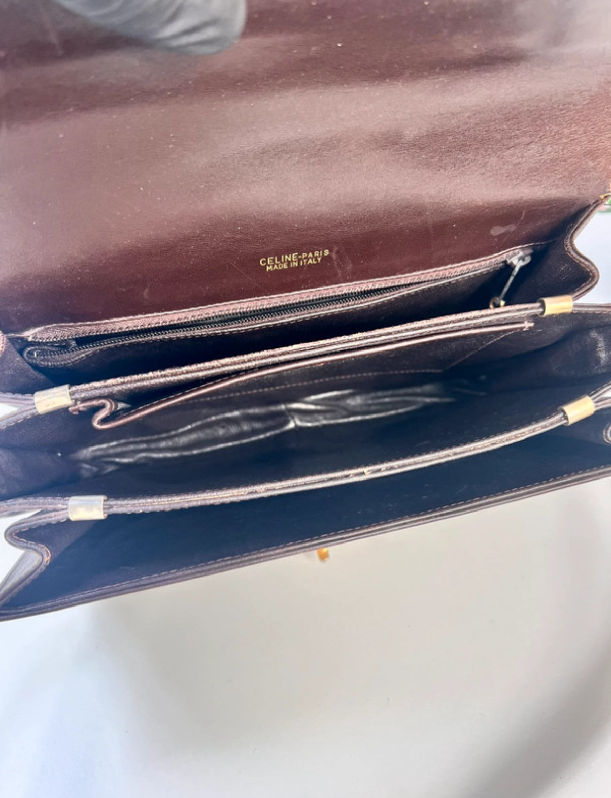 Cuir brun avec compartiments fonctionnels, traces d'usage et griffures normales pour son âge. Fermeture zippée fonctionnelle.