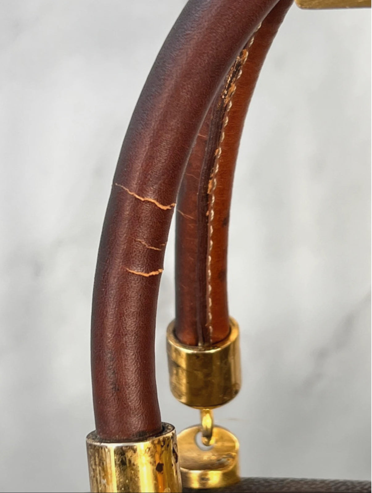 Extérieur : toile en bel état, patine et traces d'usage sur le cuir, coins légèrement frottés, poignées en cuir avec craquelures visibles, parties métalliques dorées oxydées(voir photos).