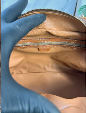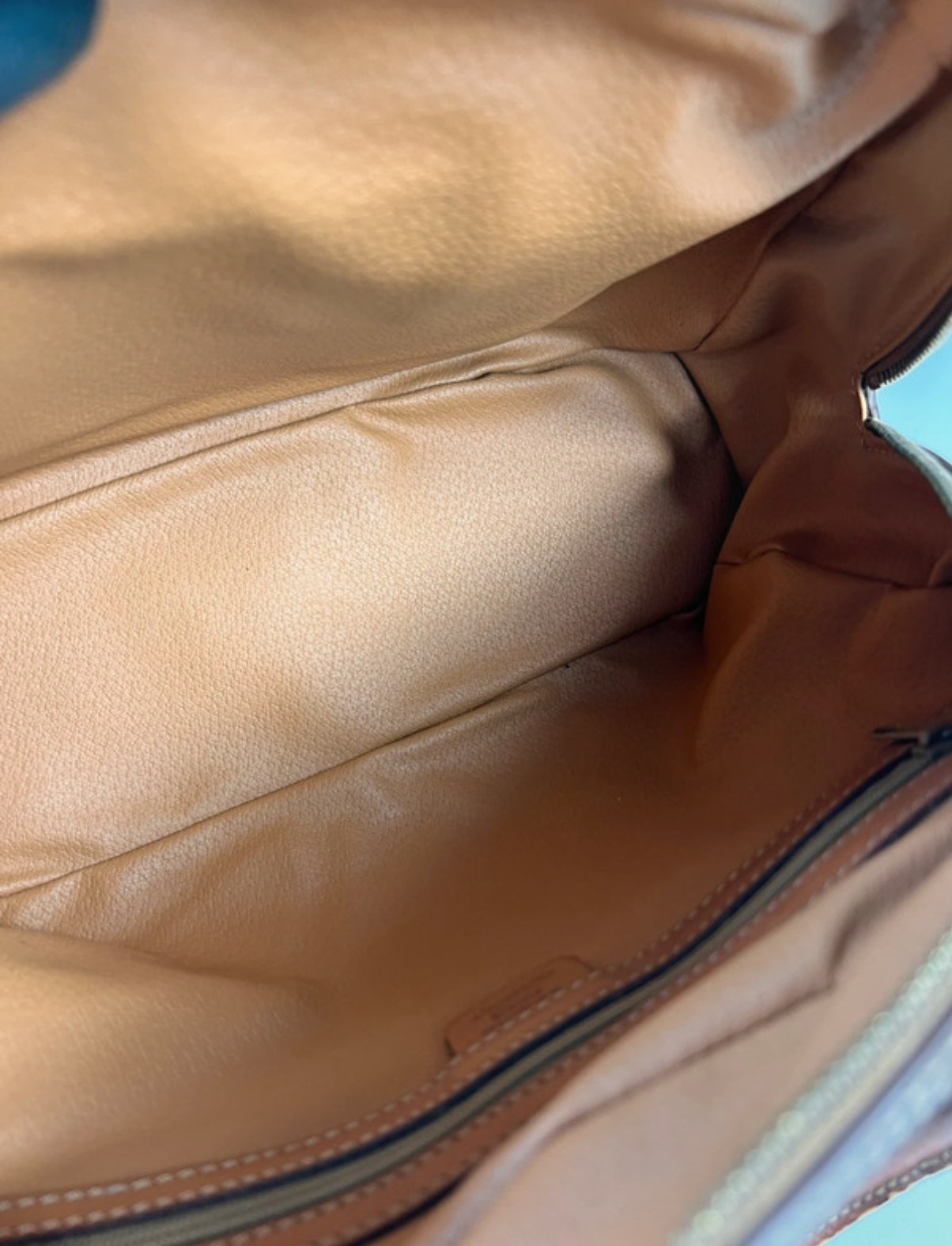 En toile enduite marron à motif Triomphe et finitions en cuir naturel, avec détails métalliques dorés.