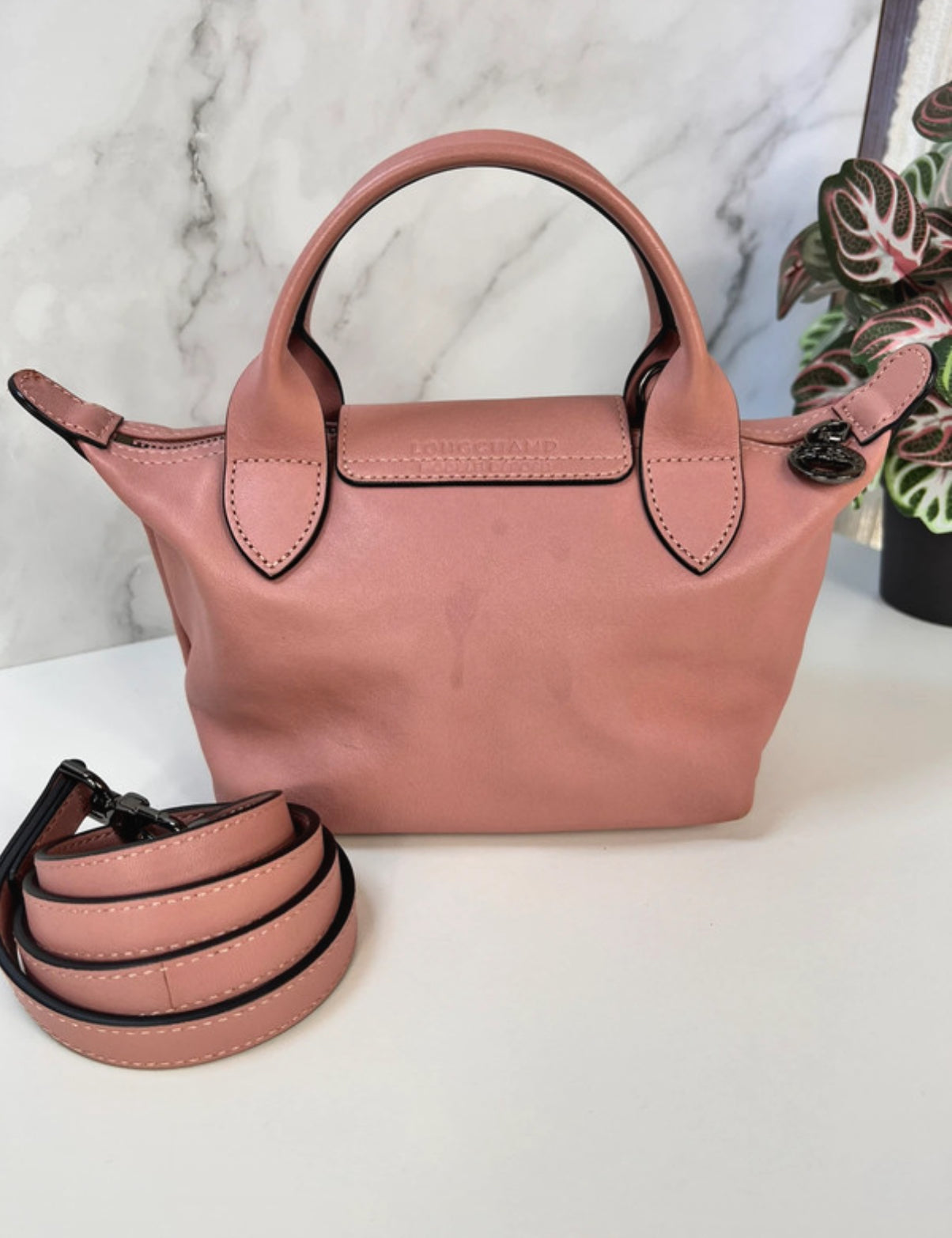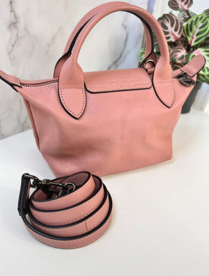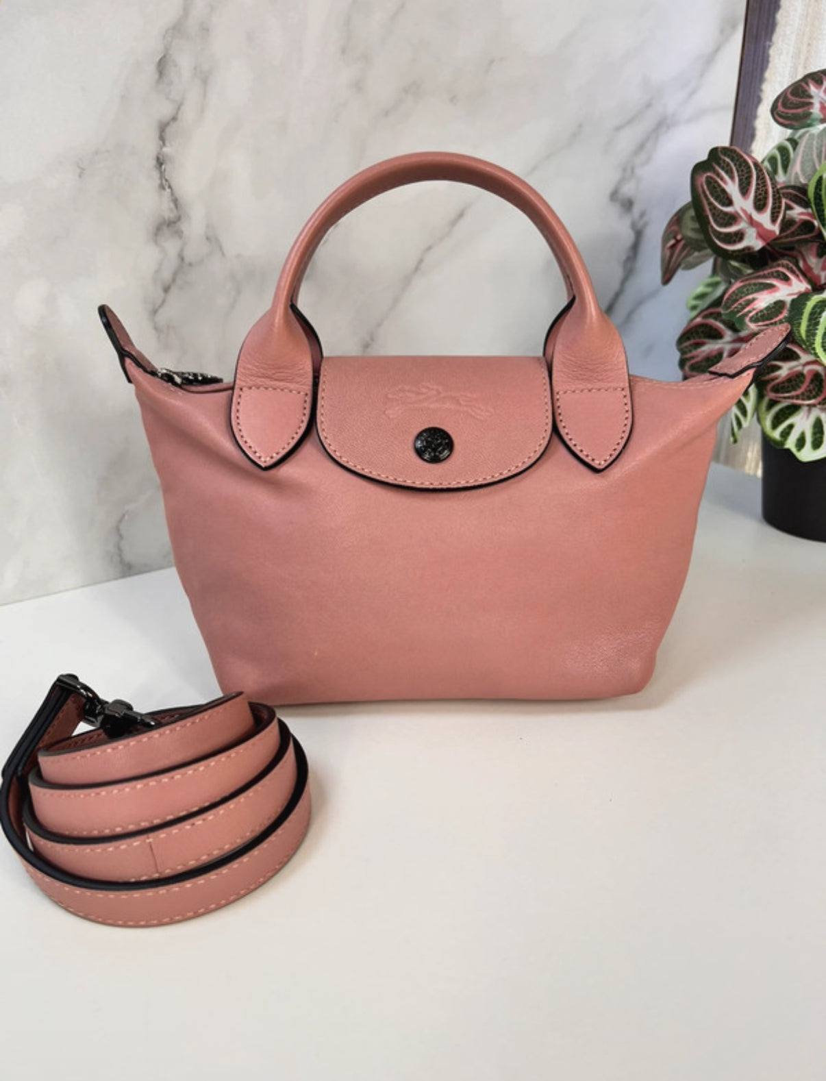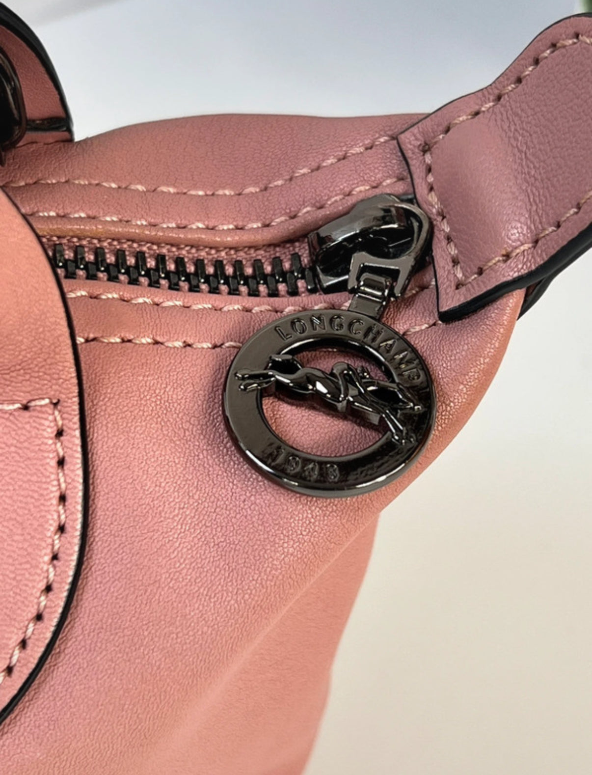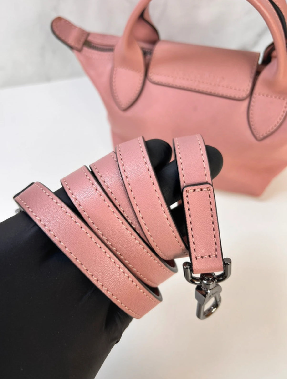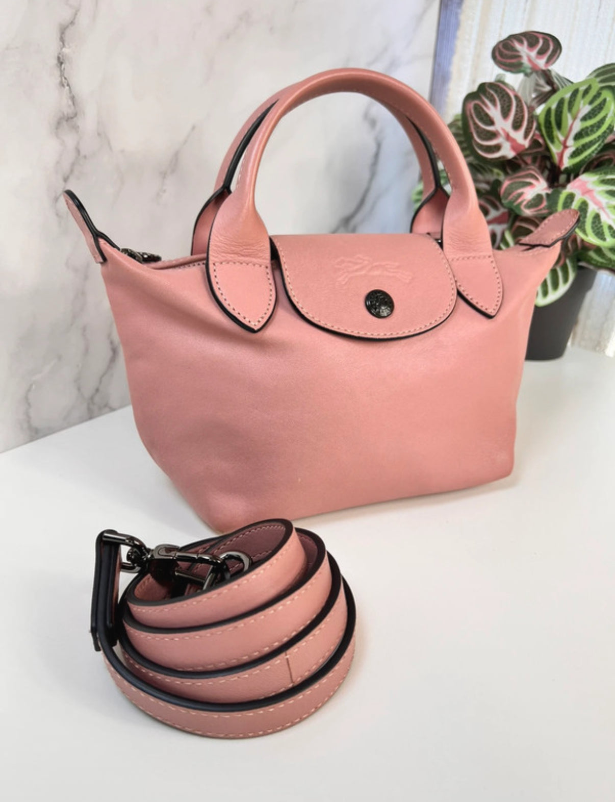 Authentique sac Longchamp Le Pliage Cuir Small en cuir rose avec bandoulière amovible.
