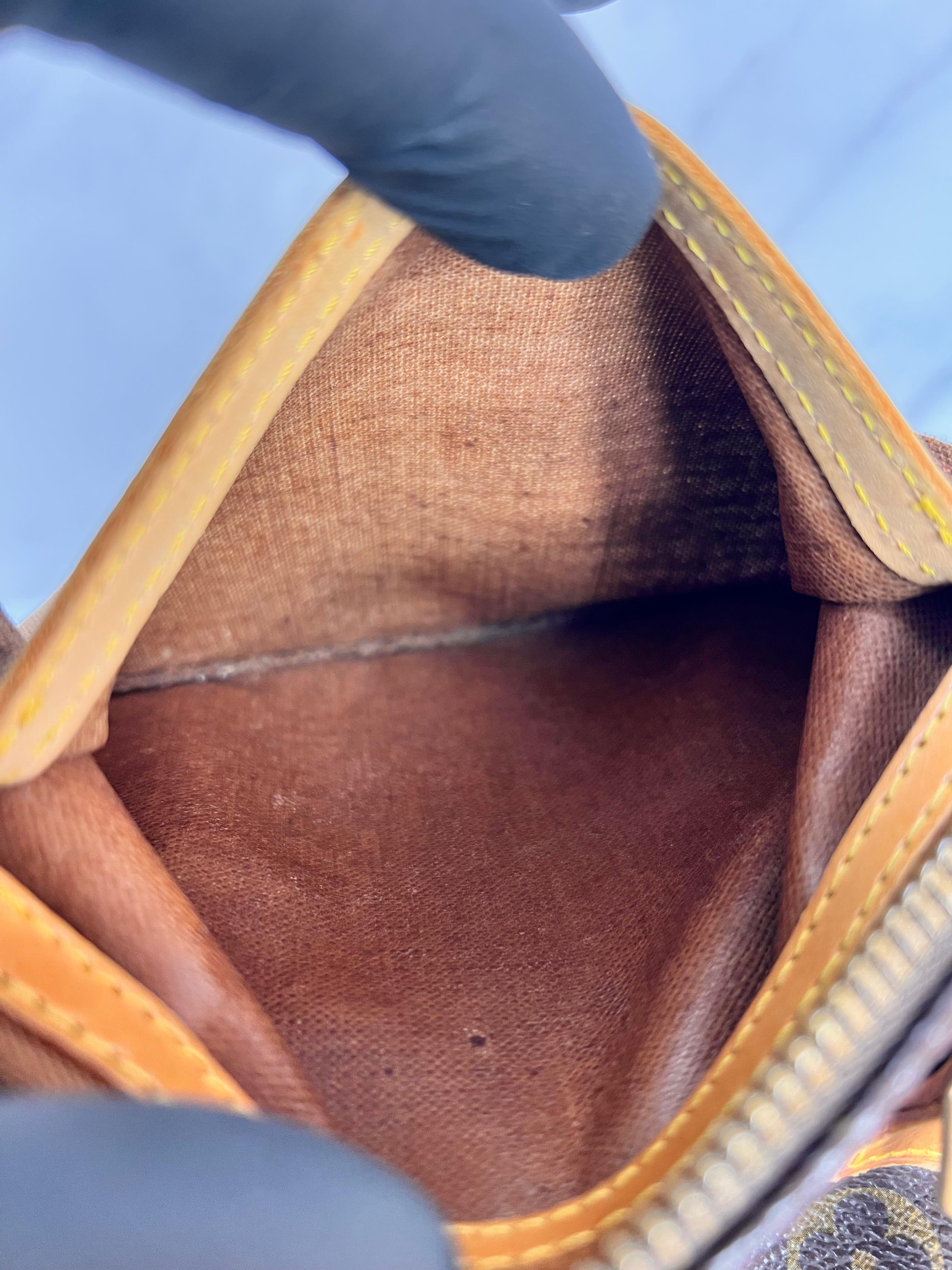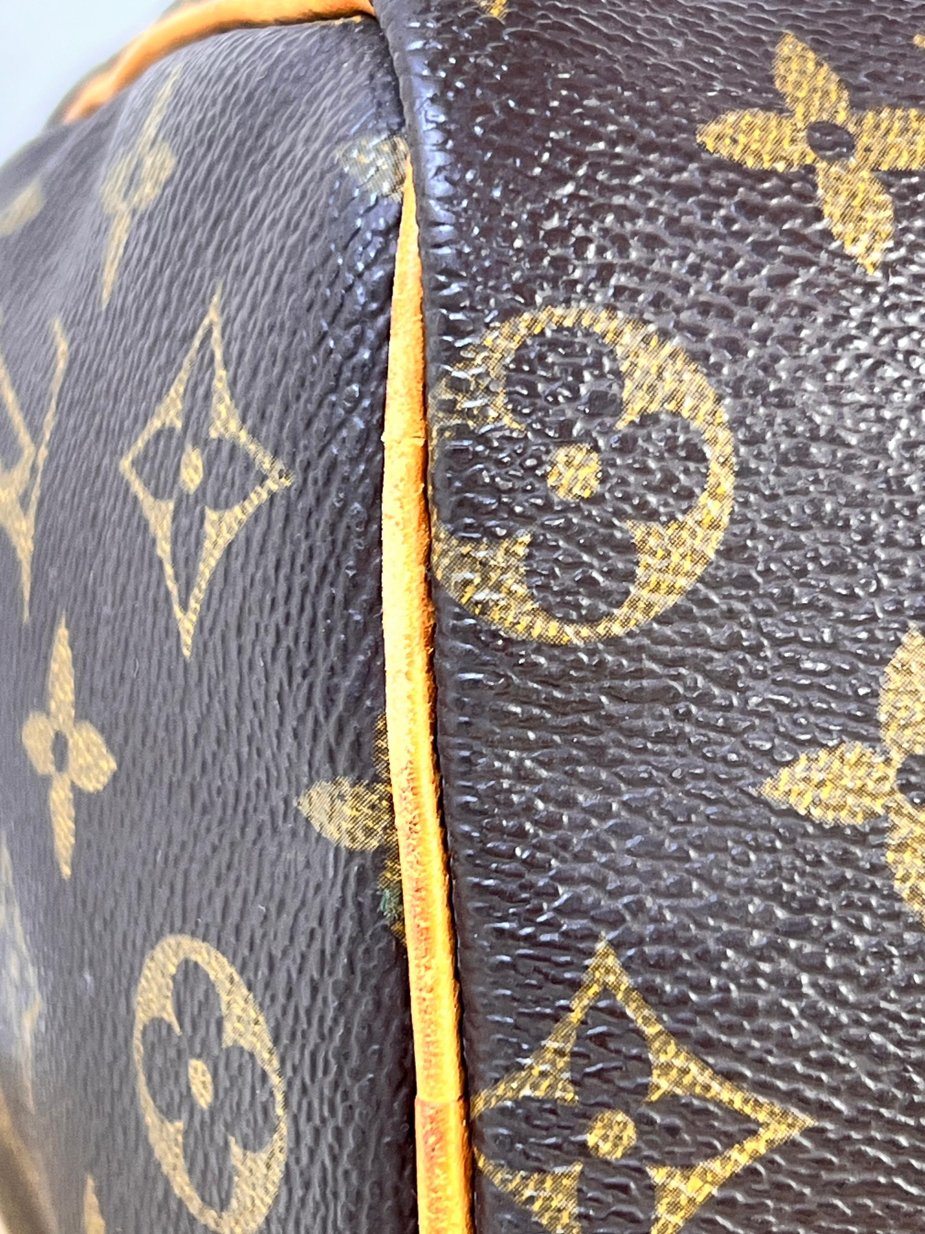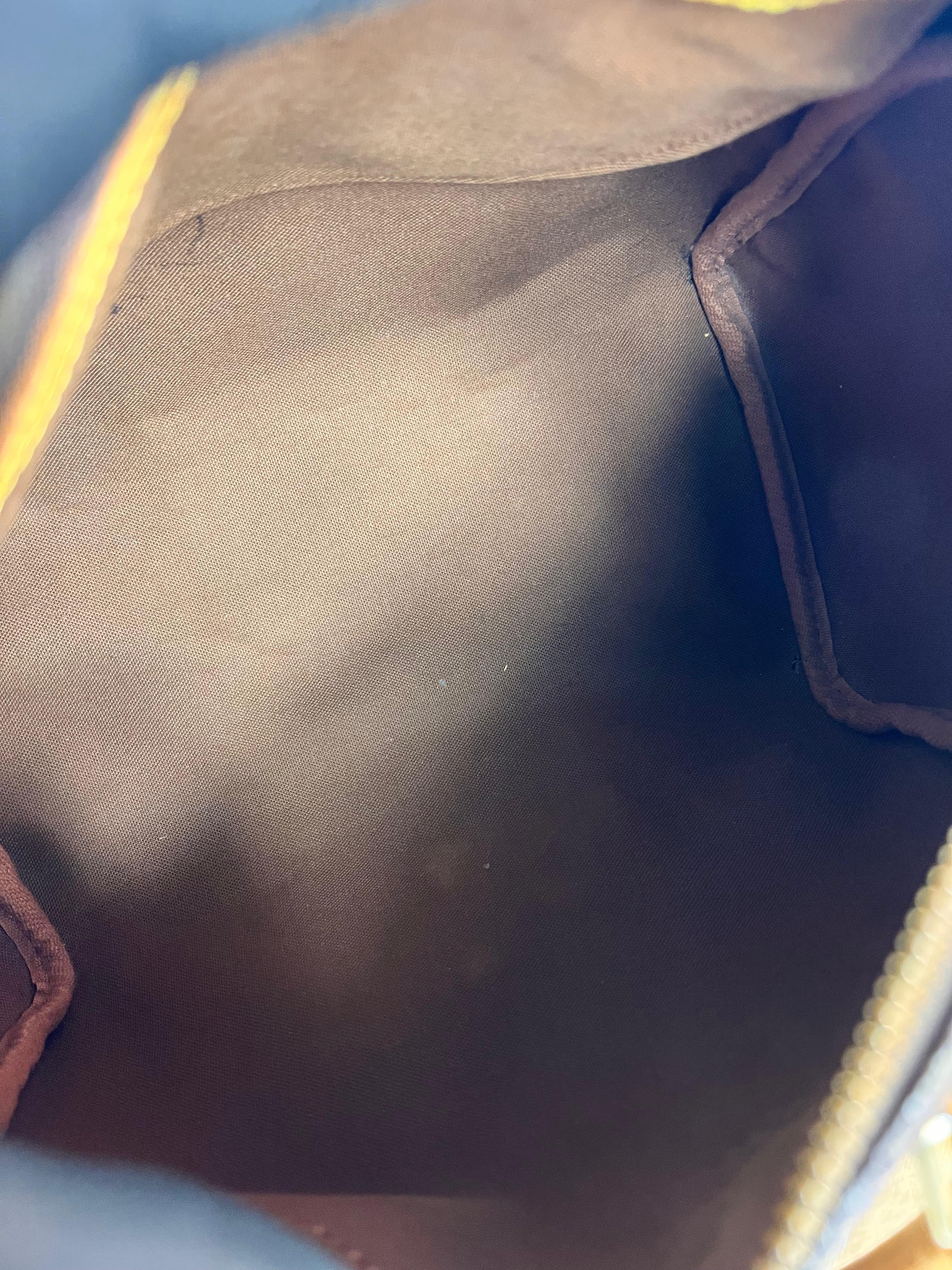 - Extérieur : toile Monogram propre, brillante et sans craquelure. Cuir patiné doré uniforme avec très belle couleur miel.