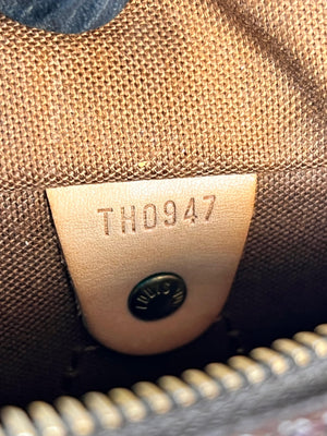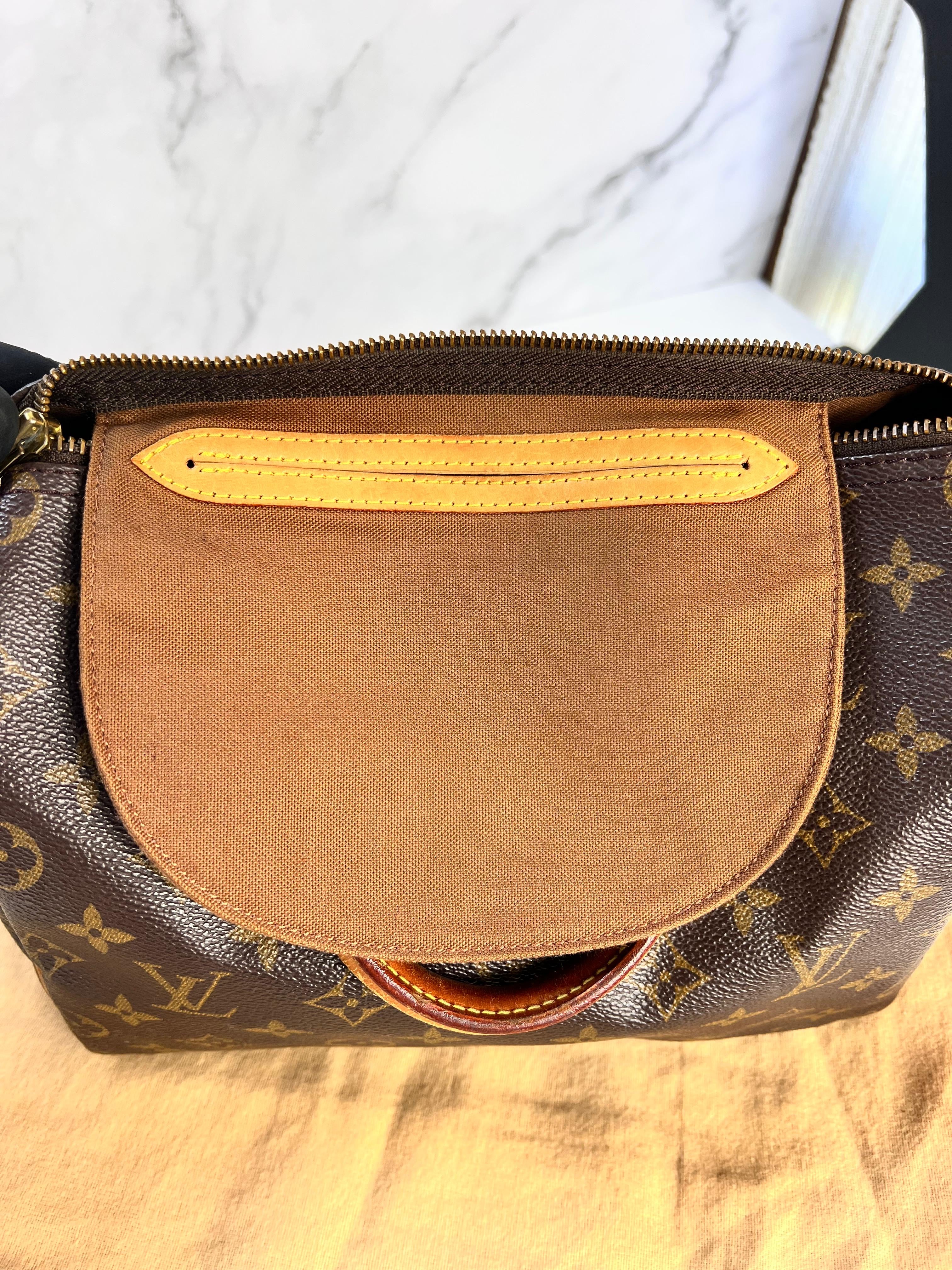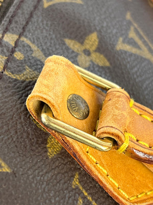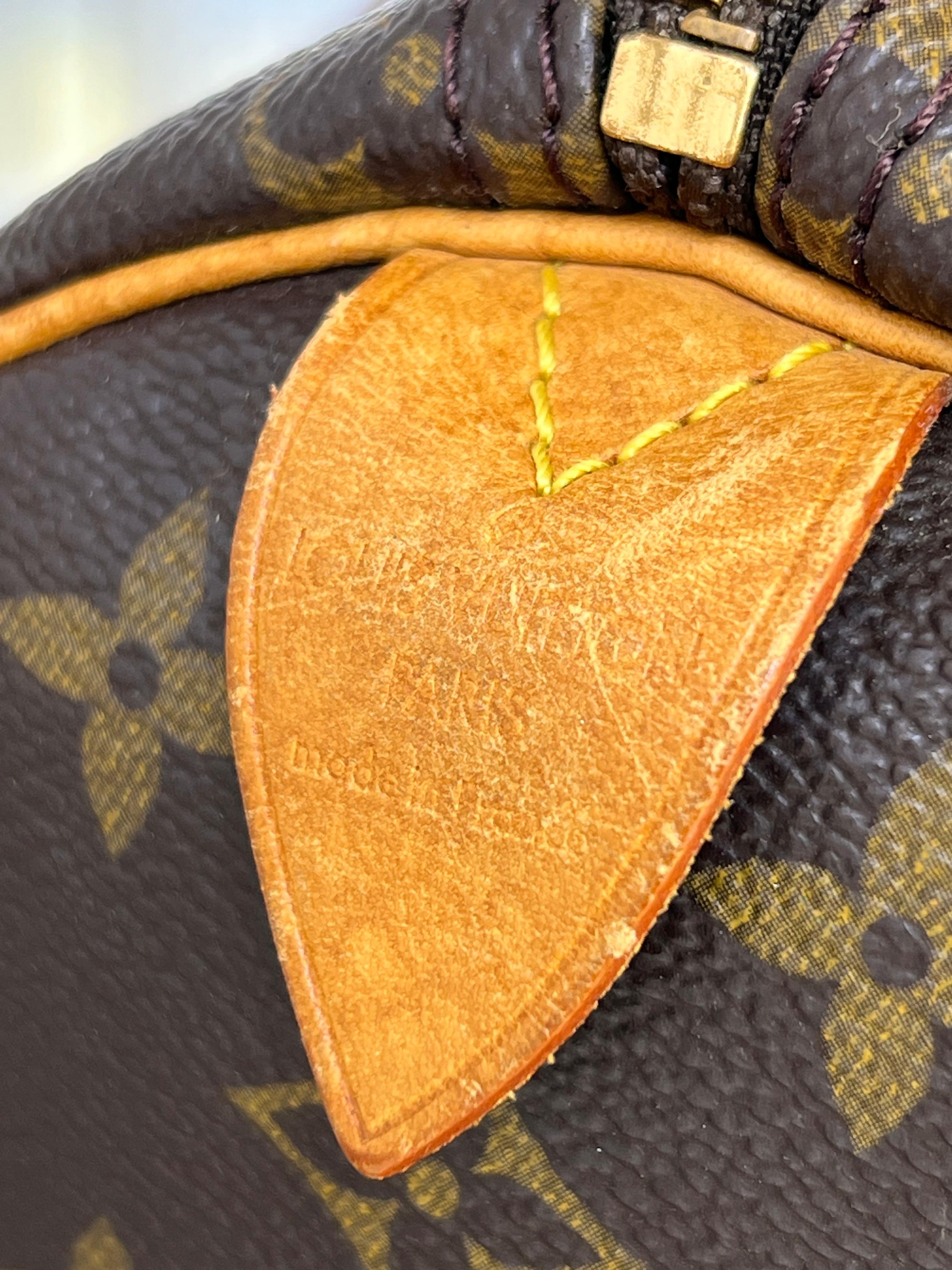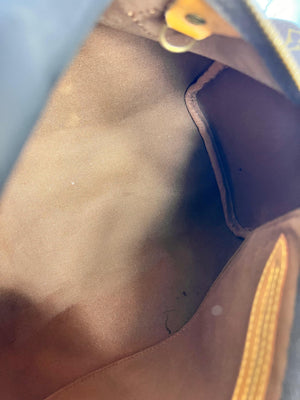 - Extérieur : toile Monogram propre, brillante et sans craquelure. Cuir patiné doré uniforme avec très belle couleur miel.
